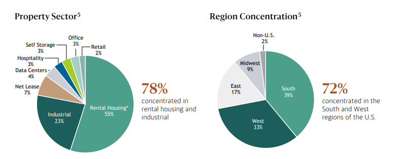 该基金有78%的资产投入出租房产和工业地产,在区域上,超过七成位于美国的西部和南部区域。