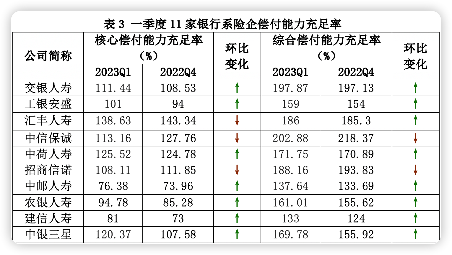 报告显示,截至一季度末,农银人寿、建信人寿的核心偿付能力充足率已降至100%以下,分别为94.78%、81%。