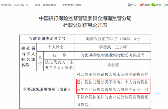行政处罚信息显示,青海共和农商行对已离职保险销售人员未及时注销执业登记;贷款五级分类不准确;个人消费贷款及生产经营贷款违规流入房地产企业;向不符合贷款条件的企业发放续贷及借新还旧贷款。根据《保险代理人监管规定》第九十四条;《中华人民共和国银行业监督管理法》第四十六条、第四十八条,对青海共和农村商业银行股份有限公司责令改正,处75.2万元罚款;对李德武给予警告,处5万元罚款;对王永辉给予警告,处2000元罚款。