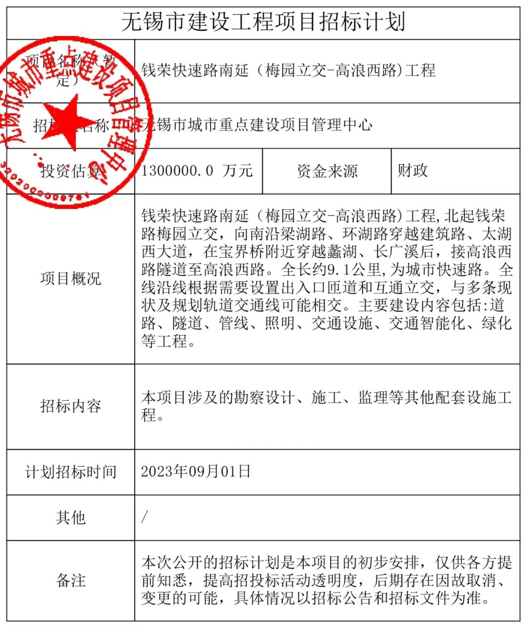 昨天(8.1)无锡公共资源交易中心发布了“钱荣快速路南延(梅园立交-高浪西路)工程招标计划”。