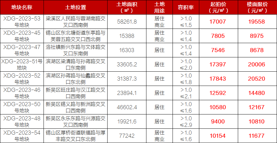 此次挂牌共9幅地块,总出让面价超32万方,其中:梁溪区1幅、锡山区2幅、惠山区1幅、滨湖区2幅、新吴区3幅;