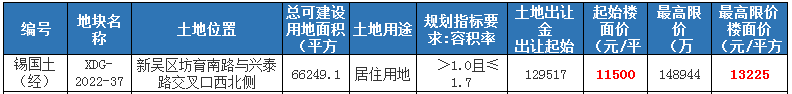 位于新吴区坊育南路与兴泰路交叉口西北侧,占地面积66249.1㎡,规划为居住用地,起拍总价129517万元,折合楼面单价11500元/㎡,最高限价148944万元,最高限价楼面价13225元/㎡。