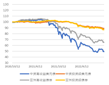 图1. 中资及亚洲美元债指数走势(基准=100)