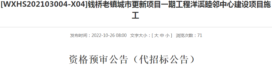 近日(10月26日),钱桥老镇城市更新项目一期工程洋溪睦邻中心建设项目施工资格预审公告(代招标公告)发布。