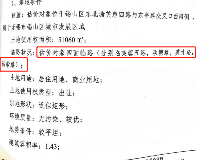 根据拍卖展示的相关文件显示,“估价对象四面临路(分别临芙蓉五路、承塘路、英才路、诚毅路)”。
